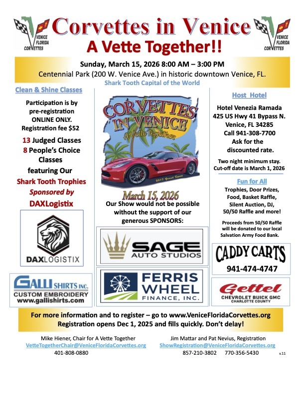 Registration Is Open If you wish to be put on an email list for the 2026 Venice Florida Corvette Club All Corvette Car Show it is available on this website Go to menu CAR SHOWS Select ADD ME TO MAILING LIST